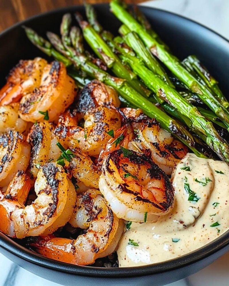 Grilled Shrimp Bowl with Asparagus & Creamy Garlic Sauce