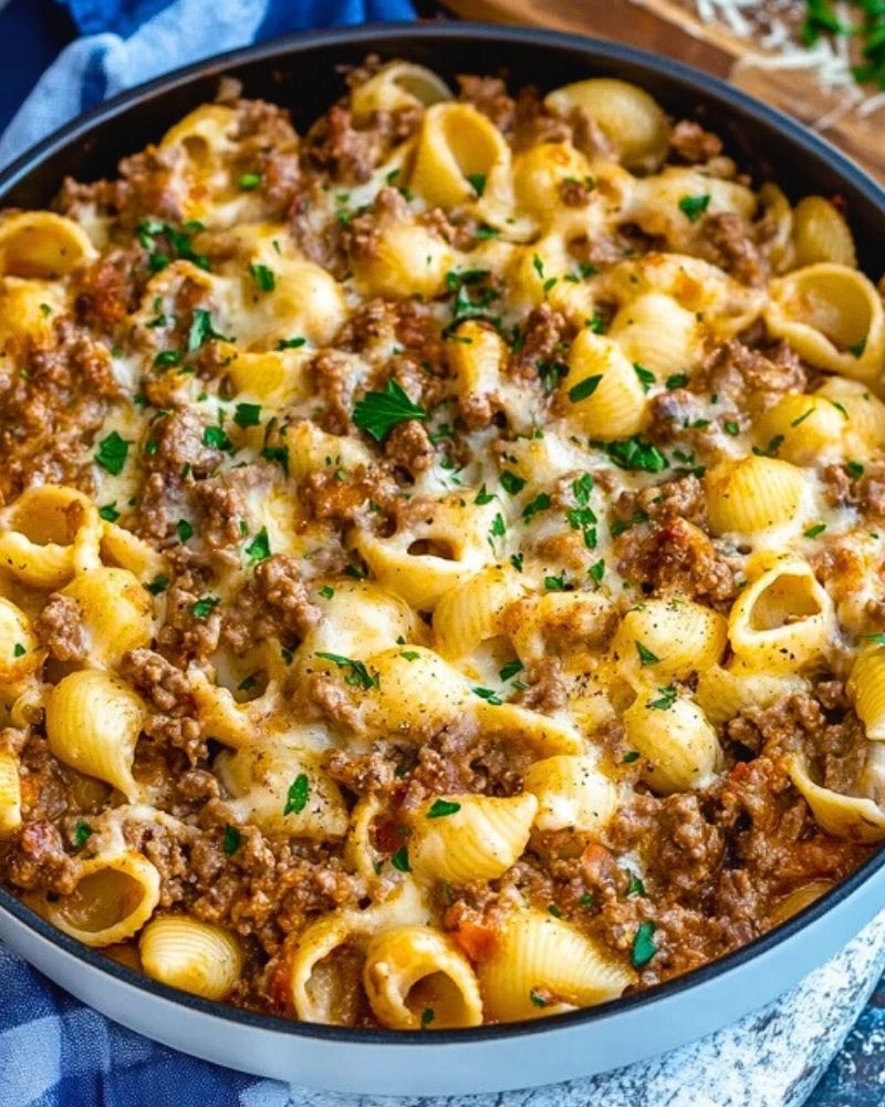 - Combine and Serve: Add the cooked pasta shells to the skillet, tossing everything together until the pasta is fully coated in the creamy beef sauce. Garnish with parsley if desired and serve immediately.