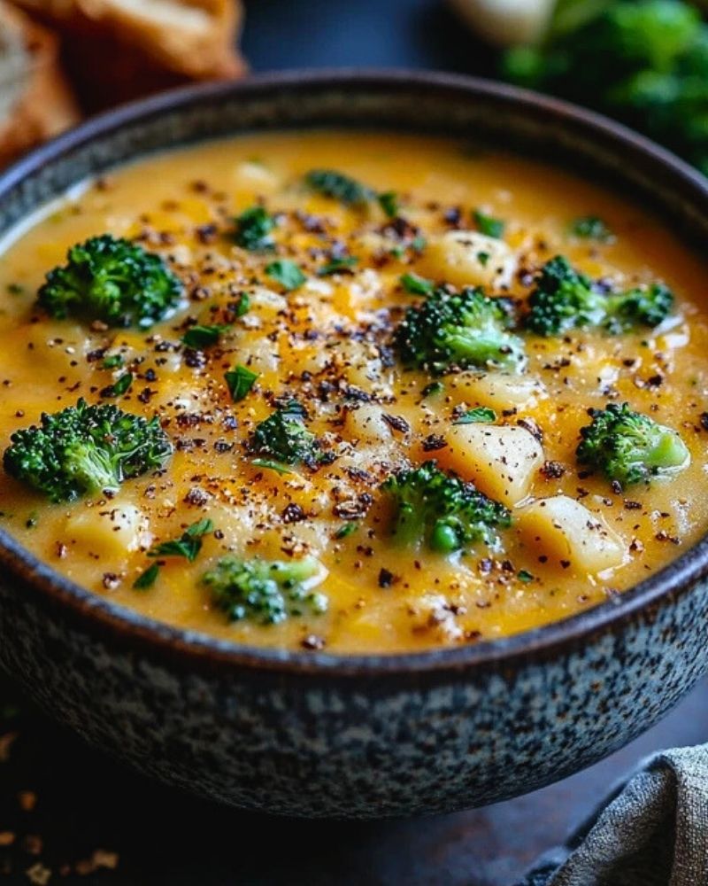 Rich, creamy, and packed with flavor, this broccoli cheddar soup is the ultimate comfort food. Made with tender broccoli florets, soft potatoes, and sharp cheddar cheese, it offers the perfect balance of texture and taste. Serve it with crusty bread for a hearty meal that’s sure to satisfy.