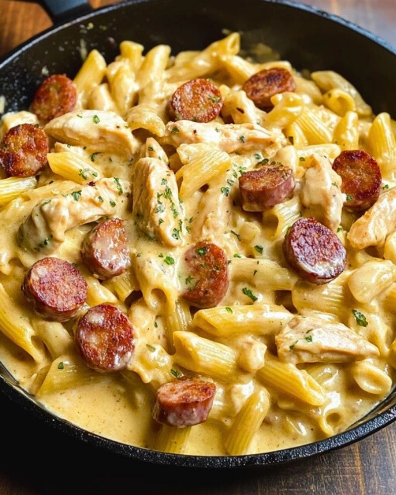 Rich, comforting, and bursting with flavor, this Creamy Cheesy Ranch Chicken & Smoked Sausage Pasta Skillet is the kind of dish that wraps you in a warm hug after a long day. With juicy chunks of seared chicken, smoky sausage slices, tender pasta, and a velvety cheese sauce infused with ranch seasoning, every bite delivers creamy, savory satisfaction. It’s a one-pan wonder that’s easy enough for a weeknight, but indulgent enough to impress guests.
