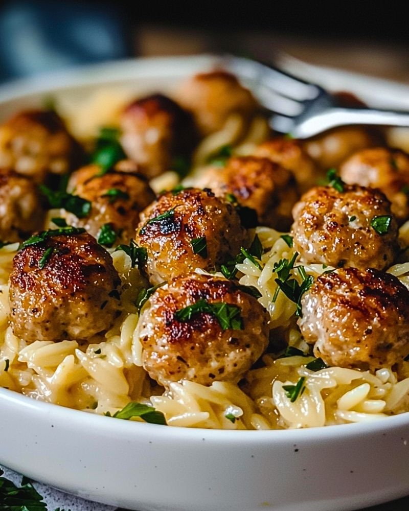 Creamy Garlic Orzo with Lemon Chicken Meatballs