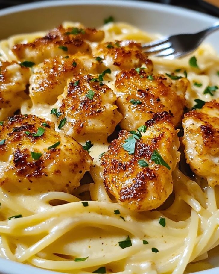 Tender, golden chicken bites nestled on a bed of velvety parmesan cream pasta — this dish is everything cozy, indulgent, and absolutely irresistible. The garlic butter sears into the chicken, creating a fragrant, crispy crust, while the creamy pasta sauce coats every strand of spaghetti in rich, cheesy goodness.