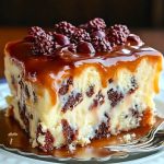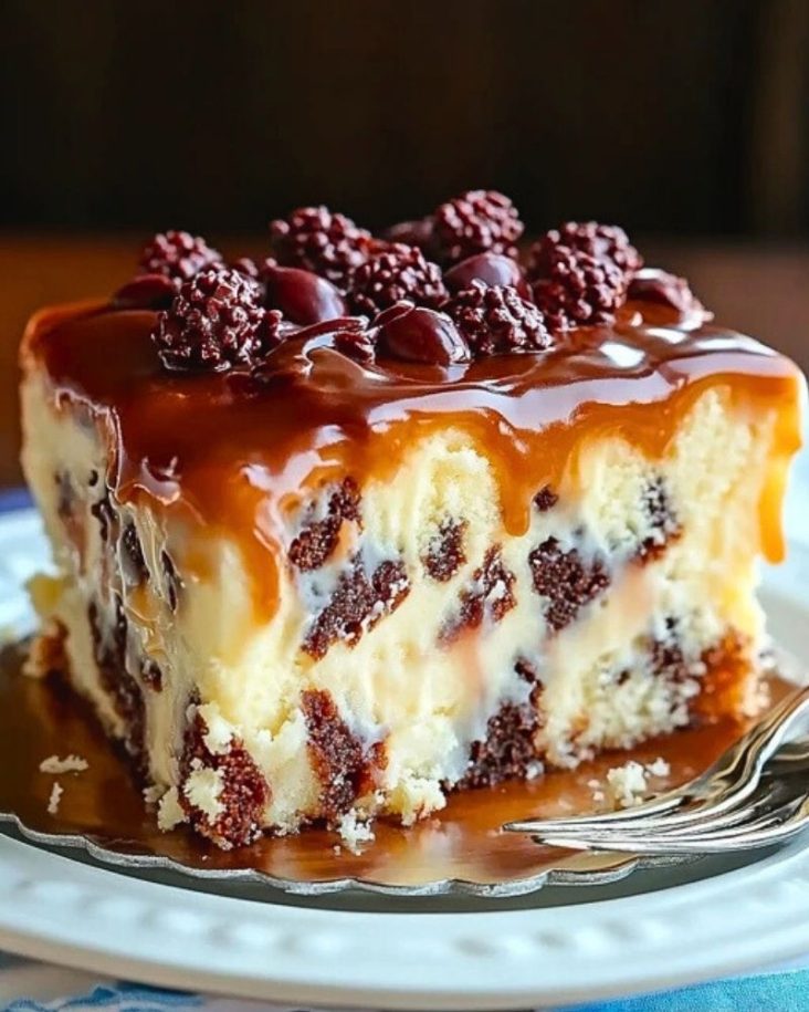 Once the cake has completely cooled, drizzle generously with warm caramel sauce. Top with fresh blackberries or cherries to add a burst of freshness and a beautiful presentation. Refrigerate for at least 30 minutes to help set the layers before slicing.