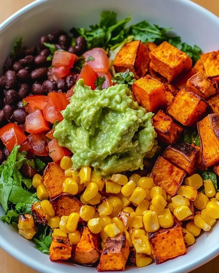 Looking for a quick lunch idea that’s hearty, healthy, and bursting with flavor? This Healthy Sweet Potato Burrito Bowl is your go-to answer. Loaded with roasted sweet potatoes, black beans, corn, fresh greens, and creamy guacamole, it’s one of those easy recipes that checks all the boxes—nutritious, satisfying, and endlessly customizable. Whether you’re in search of easy dinner recipes or clean food ideas, this veggie-packed bowl is ideal for meal prep and fast weeknight meals.