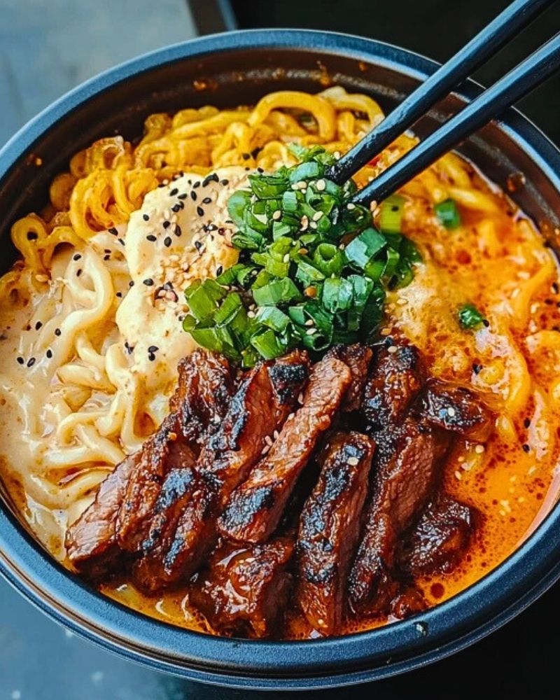 This Spicy Korean Ramen with Grilled Beef & Creamy Sauce is a flavor-packed bowl of comfort that blends the bold heat of Korean chili, the smoky richness of grilled beef, and the indulgent touch of creamy, savory sauce. Each slurp of the fiery noodles wraps your taste buds in a warm, satisfying hug, while tender slices of marinated beef offer an irresistible smoky bite. Finished with a drizzle of creamy mayo-like sauce and garnished with black sesame seeds and fresh scallions, this dish doesn’t just satisfy hunger—it seduces the soul.